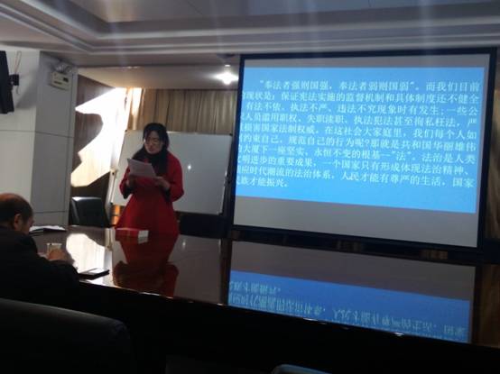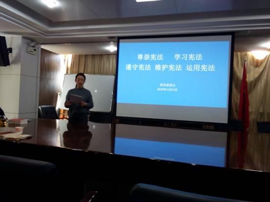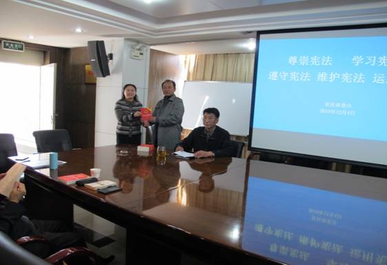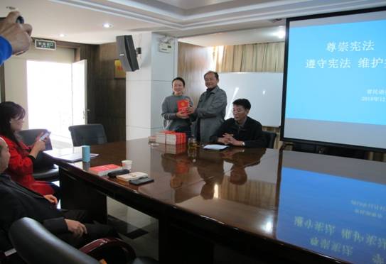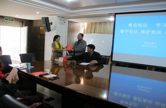国家宪法日宣传进行了丰富多彩的活动,在办公楼正大门悬挂标语“弘扬法治精神,推进法治建设”横幅,省民语委办主任普学旺同志向办公室和各科室负责人赠送宪法文本,组织刘艳芳、祁文秀、杨海林、董文菲、付莎等5位同志进行了学宪法讲宪法演讲。