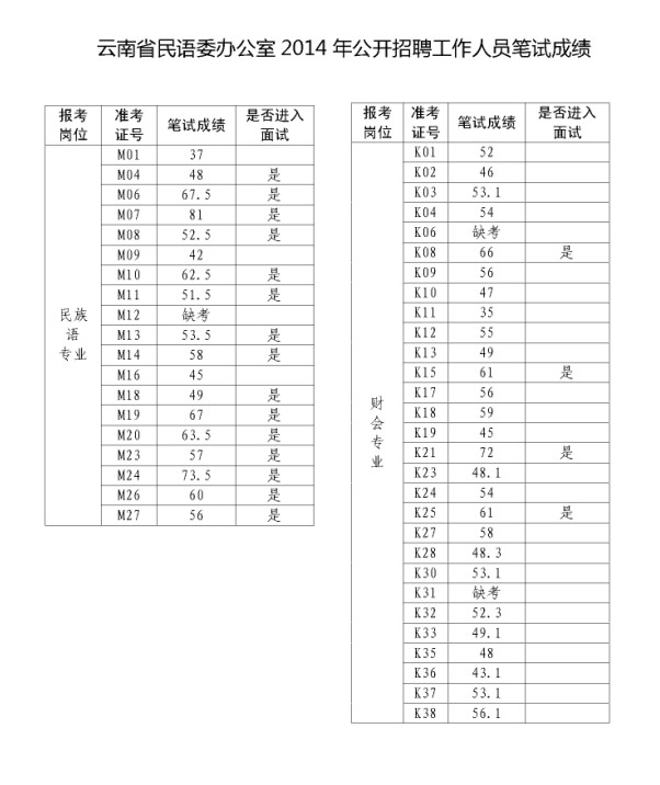 根据《云南省民语委办公室2014年公开招聘工作人员公告》相关规定,现公布省民语委办公室2014年公开招聘工作人员笔试成绩(见附件),面试事宜另行通知。